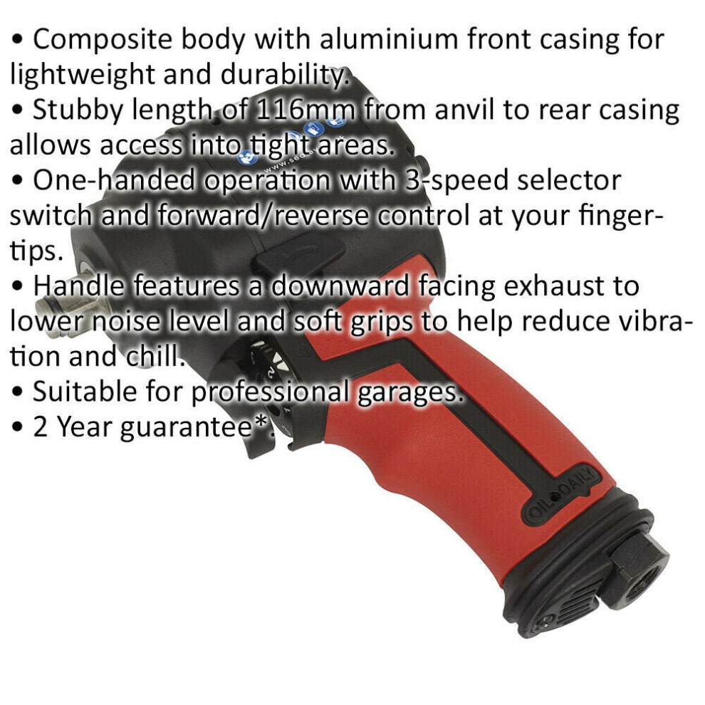 Stubby Air Impact Wrench - 1/2 Inch Sq Drive - Twin Hammer - 3-Speed Selector Description